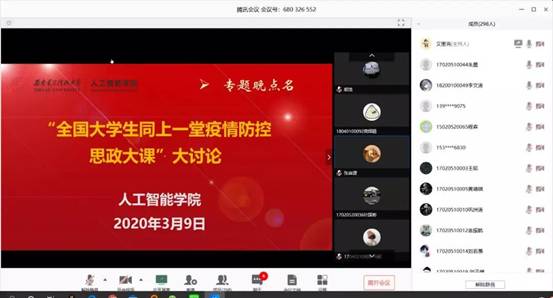 大课结束后,yl7703永利官网辅导员杨坤和白璐芸,分年级组织召开了线上的主题晚点名—“全国大学生同上一堂疫情防控思政大课”大讨论,通过腾讯视频、哔哩哔哩等直播软件,与全体智能学子交流分享了听课感受。通过学习,同学们纷纷表示对疫情有了更生动全面的了解,对我国社会制度有了更深度的自信,对青年一代的使命担当有了更清晰的认识。