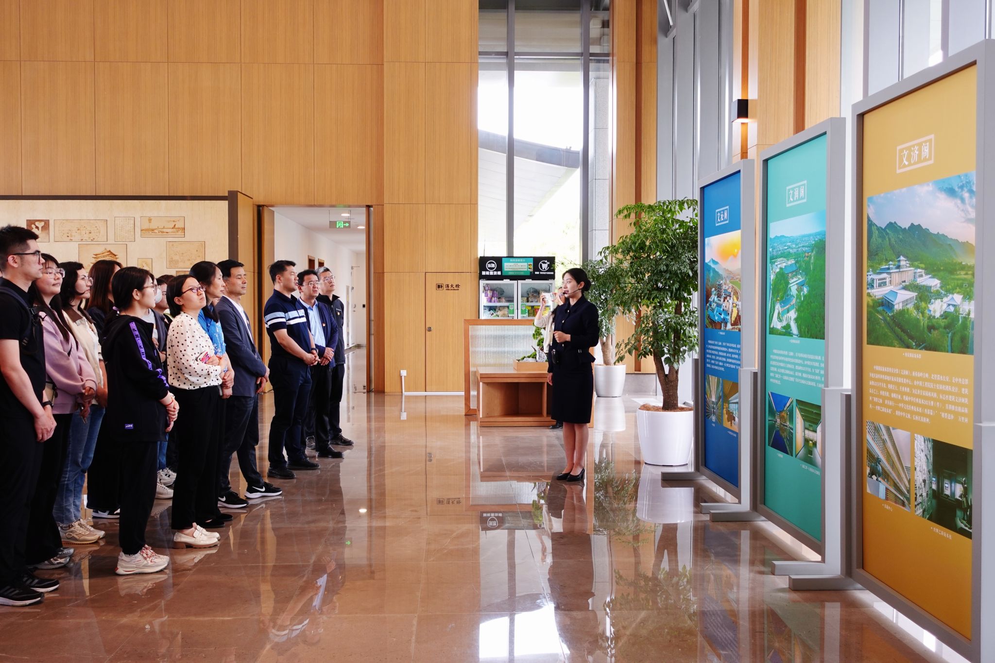 随后,大家穿过彰显汉唐园林风格的文济池,拾级而上,来到了版本馆的核心区域——保藏中心进行参观。保藏中心文济厅书墙通高20米,长90米,分为上下4层,共陈列展示精品图书5万余册。映入眼帘的《永乐大典》内容包括经、史、子、集,涉及天文地理、阴阳医术、占卜、释藏道经、戏剧、工艺、农艺,涵盖了中华民族数千年来的知识财富,成为了中华文化的一个重要符号。5万余册典籍版本无声地诉说着中华文明源远流长的故事,引导党员同志们更加深刻地认识到国家版本馆在保护和传承文化根脉中承担的重要角色。