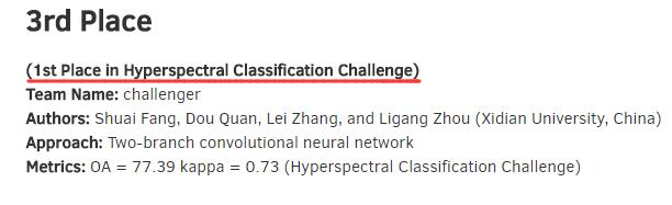 2018年IEEE GRSS Data Fusion Contest结果揭晓,西电yl7703永利官网焦李成教授团队分别在三个赛道取得了丰硕成绩,其中高光谱分类赛道,王爽教授指导的队伍challenger(方帅,权豆等)获得第一名;多光谱LiDAR数据分类赛道,焦李成教授指导的队伍IPIU(程林,李阁等)获得第三名。