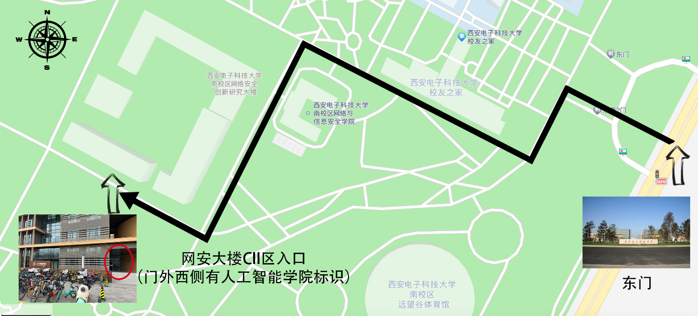 永利官网将于3月30日进行2024年研究生招生考试综合面试,学院位于网安大楼南侧,入口处有学院标志牌,从学校东门进入后到达学院路线图如下: