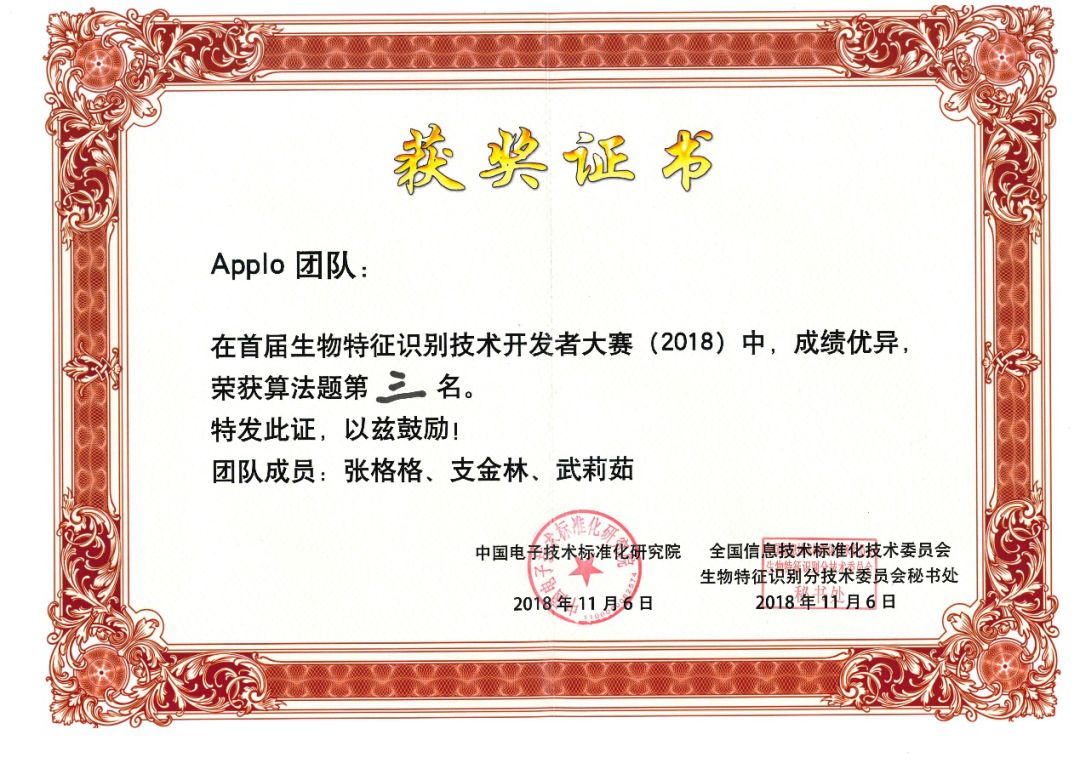 据悉,大赛历时两个多月,吸引了174支队伍,共计320人参加,算法题通过AUC指标对算法的性能进行排名,初赛选取前20进入复赛,Applo团队在初赛阶段就以第5名的成绩,成功入围复赛,复赛阶段,除了AUC指标的算法排名,还需要提交依据GB/T26237.5-2014《信息技术 生物特征识别数据交换格式 第5部分:人脸图像数据》标准生成“人脸数据记录单元”用于标准符合性测试,在通过标准符合性测试的团队中,取前3入围决赛,参与现场答辩,以复赛排名70%和答辩30%的比例进行最终成绩的加权,经过激烈的角逐,yl7703永利官网硕士研究生张格格所在队伍Applo取得了大赛季军,颁奖典礼在11月6日举办的全国信标委生物特征识别分委会(TC28/SC37)2018年全会上作为会议上的一个重要环节进行,与会领导为西电智能学子颁发获奖证书。