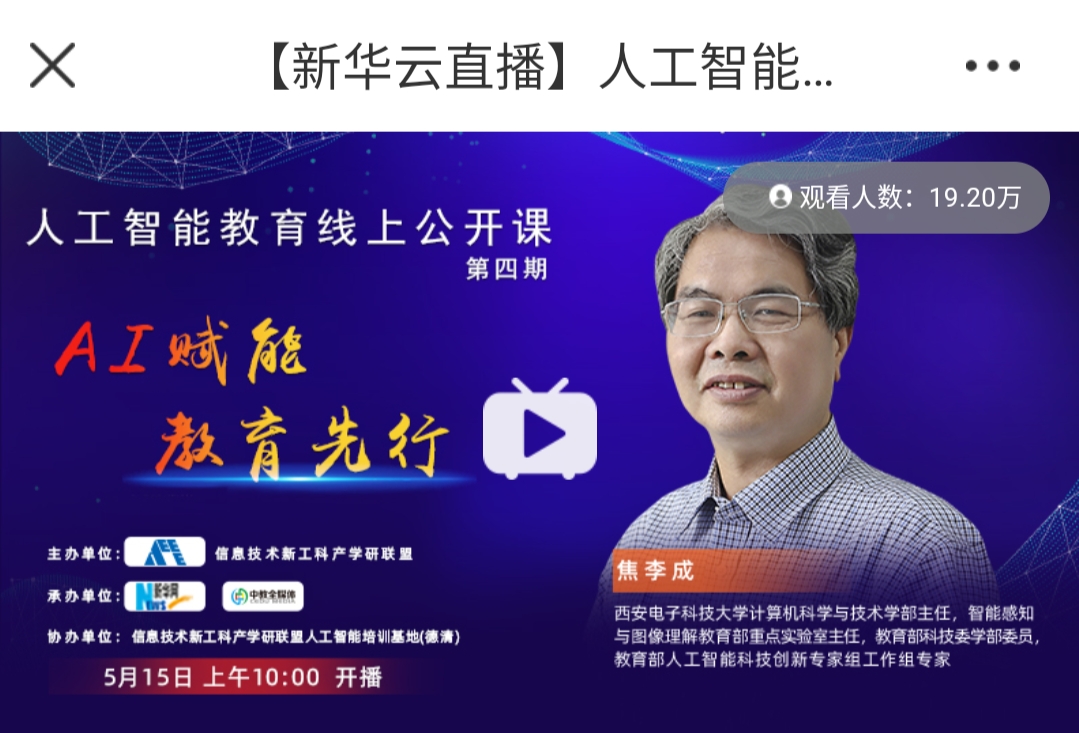 2020年5月15日,由信息技术新工科产学研联盟主办,华网、中教全媒体承办,信息技术新工科产学研联盟人工智能培训基地(德清)协办的“人工智能教育线上公开课”第四期,在新华网客户端云直播及中教全媒体直播平台同步播出。计算机科学与技术学部主任、yl7703永利官网焦李成教授做了题为“人工智能人才培养的挑战与思考”的精彩报告。