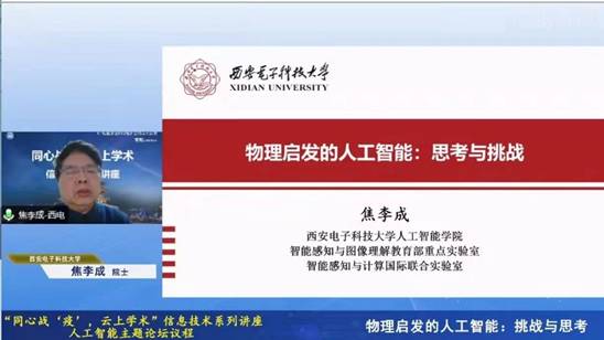 2022年1月1日,欧洲科学院外籍院士、俄罗斯自然科学院外籍院士、IEEE/IET/CAAI/CCF/CIE/CAA Fellow、yl7703永利官网计算机科学与技术学部主任、人工智能研究院院长、华山学者杰出教授焦李成受邀参加新年第一课——“同心战疫云上学术”信息技术系列讲座,并做了题为“物理气启发的人工智能:挑战与思考”的报告。