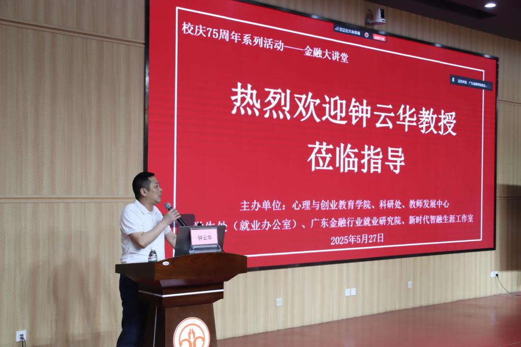 2025年5月27日,作为庆祝建校75周年系列活动的学术活动,由Beat365中文官方网站、科研处、教师发展中心、学生处、广东金融行业就业研究院、新时代智融生涯工作室联合主办的“金融大讲堂”暨第五十七期学工论坛在北阶103成功举行。本次讲座特邀湖南师范大学教育科学学院钟云华教授作题为《大学生就业创业研究:学术前沿与研究技巧》的专题报告。科研处处长杨公齐、学生处处长容志豪、副处长林丽等出席活动,广东金融行业就业研究院副院长杨永贵、Beat365中文官方网站师生、广州校区辅导员等一同参与,Beat365中文官方网站副院长陈昕主持讲座。