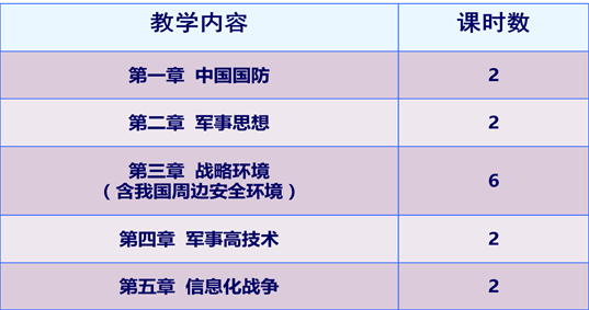 每章内容以教材的理论知识为基础,结合当前的政治和军事时事、国内外局势,以专题的形式在课堂上进行讲授。同时,会结合课堂讲授的内容,播放军事时事视频资料,让学生在课堂内外展开讨论,并形成书面材料。