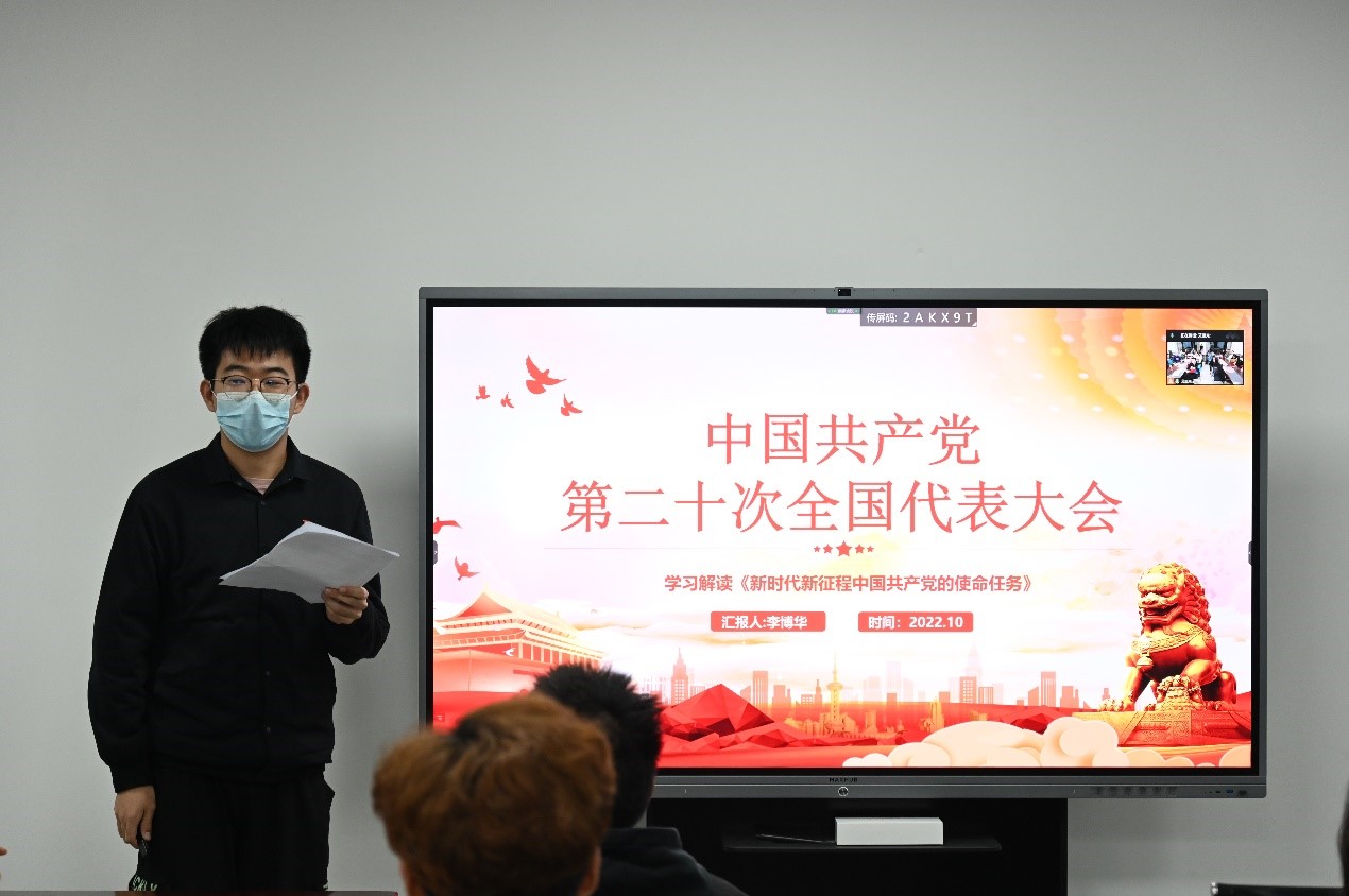 朱红星为支部全体党员带来了题为《自信自强的青年是中华民族伟大复兴之希望》的专题党课。他从“思想武装,指导实践”“坚定信念,团结奋斗”“从我做起,绽放青春”三个方面与大家分享了自己学习二十大报告的深刻体会。朱红星鼓励各位青年党员:“从我做起、从现在做起,自信自强、守正创新,踔厉奋发、勇毅前行,坚定不移听党话、跟党走,并且准备经受风高浪急甚至惊涛骇浪的重大考验,全力战胜前进道路上各种困难和挑战,依靠顽强斗争打开事业发展新天地!”
