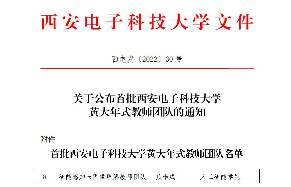 近日,学校印发《关于公布首批yl7703永利官网黄大年式教师团队的通知》(西电发〔2022〕30号),认定全校8个教师团队为首批yl7703永利官网黄大年式教师团队,yl7703永利官网焦李成院士带领的“智能感知与图像理解教师团队”入选。