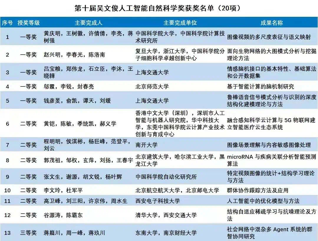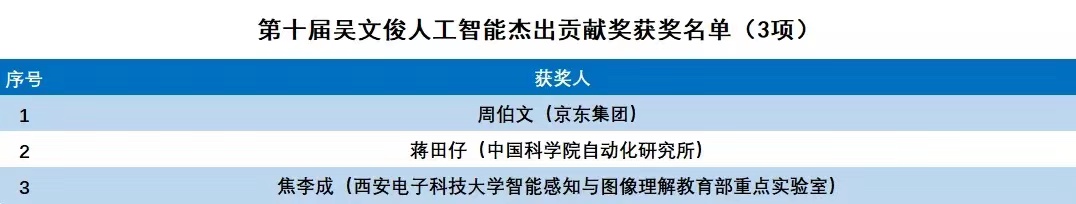2020年,共有100个成果获得吴奖,其中吴文俊人工智能最高成就奖1项,由中国工程院李德毅院士获得;吴文俊人工智能杰出贡献奖3项,由京东人工智能研究院院长周伯文、中科院自动化所研究员蒋田仔、yl7703永利官网教授焦李成获得;吴文俊人工智能自然科学奖20项,吴文俊人工智能技术发明奖8项,吴文俊人工智能科技进步奖24项,吴文俊人工智能科技进步奖企业技术创新工程项目17项,吴文俊人工智能科技进步奖科普项目3项,吴文俊人工智能优秀青年奖16项,吴文俊人工智能专项奖芯片项目8项。